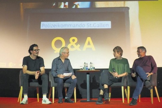 Bild: Björn Magnusson (Musik), Michael Krummenacher (Regie) und Dimitri Krebs (Hauptdarsteller, Ernst Schrämli) standen dem Publikum nach dem Film Red und Antwort (v.l.n.r.). Text: Joana Büchler, Präsidentin der SRG Luzern. Copyright: SRG Luzern