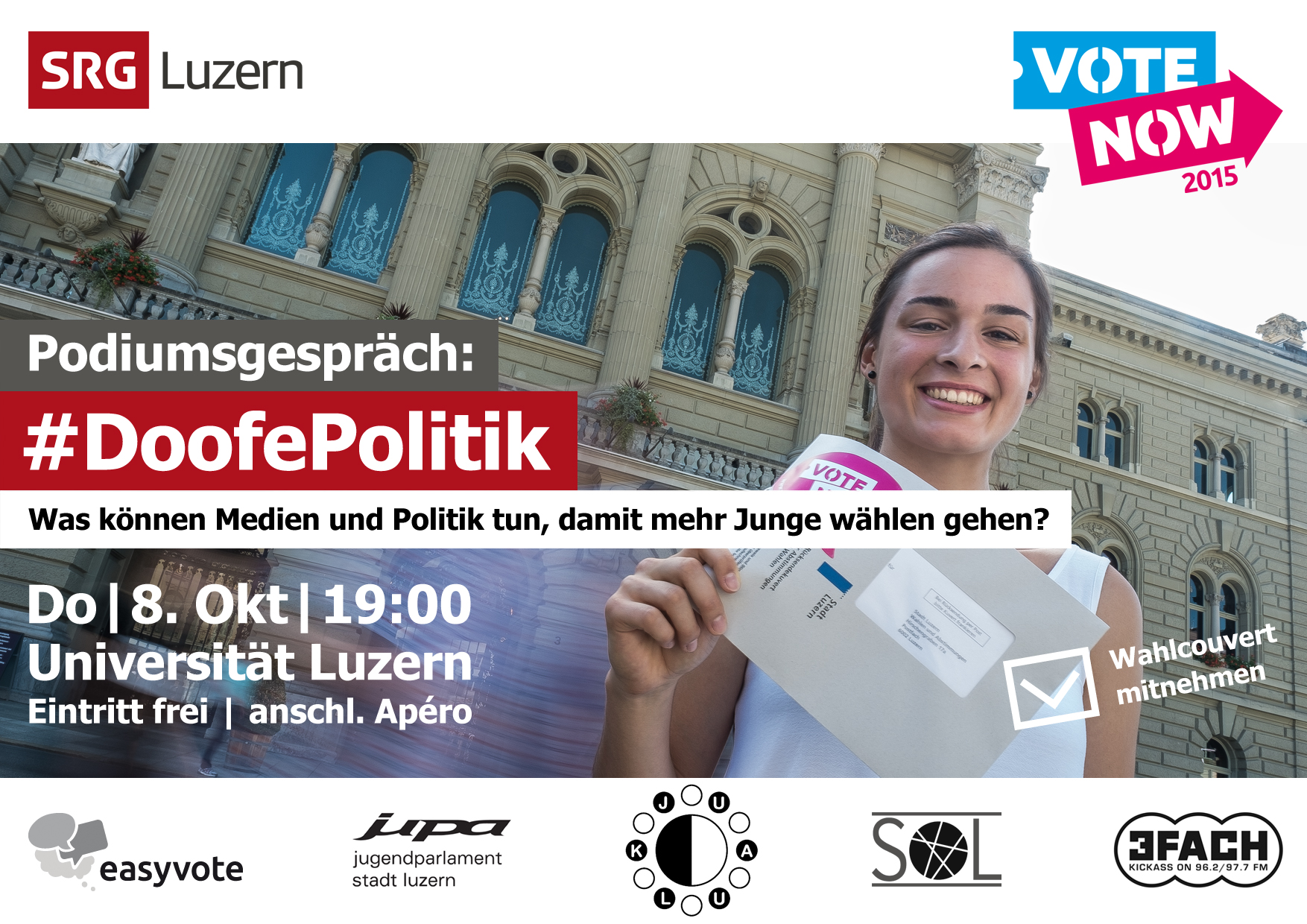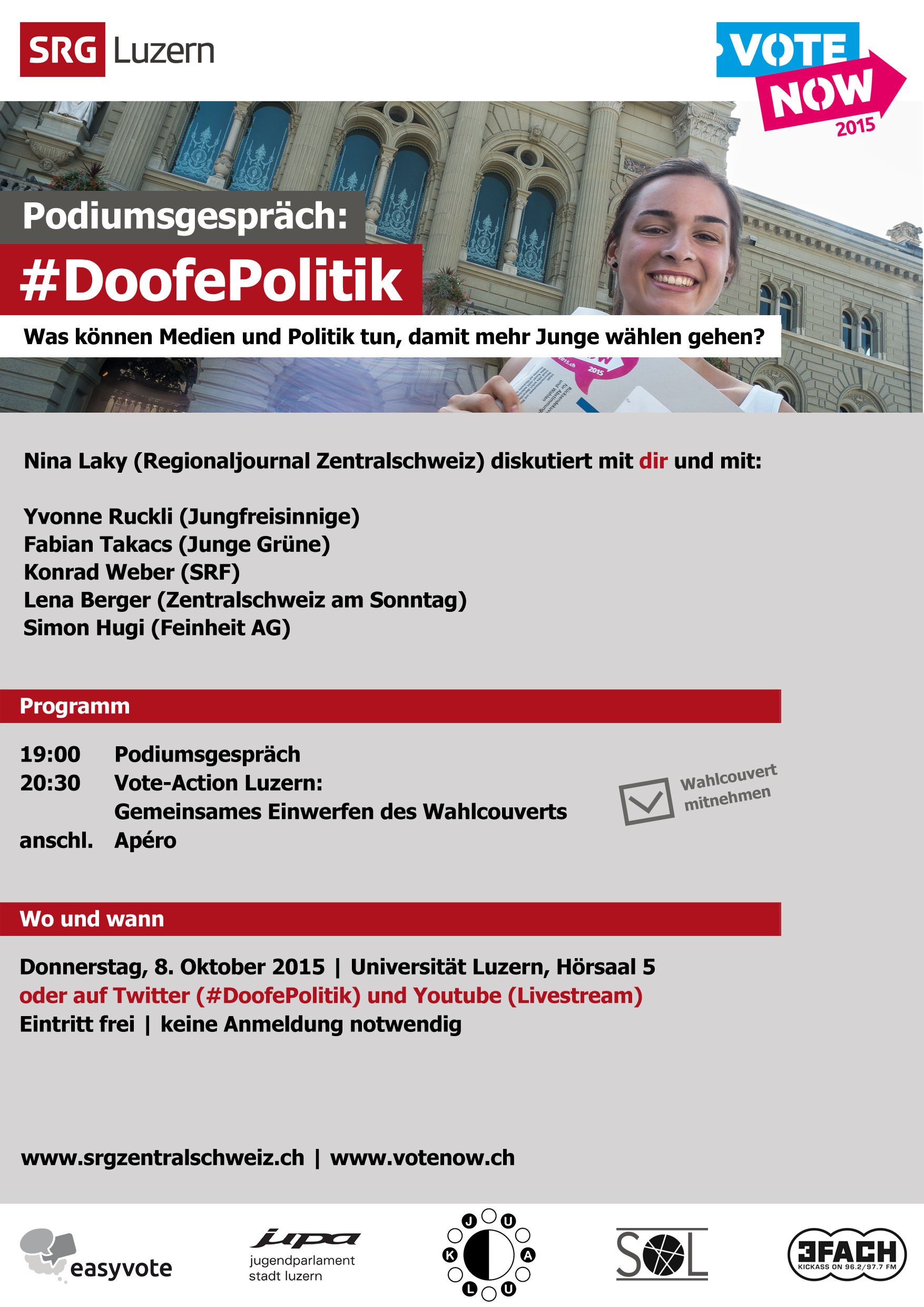 Wo und wann: Donnerstag, 8. Oktober, 19.00 Uhr, Uni Luzern, Hörsaal 5. Oder auf Twitter (#DoofPolitik) und Youtube (Livestram).
