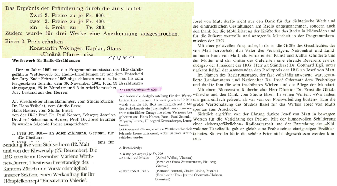 - 1956 gewinnt Konstantin Vokinger von Stans 600 Franken im Hörspielwettbewerb der IRG. Sein Hörspiel «Umänä Pfarrer uis» sei zwar noch nicht sendefertig, heisst es im Jahresbericht, aber das beste der eingereichten Hörspiele.