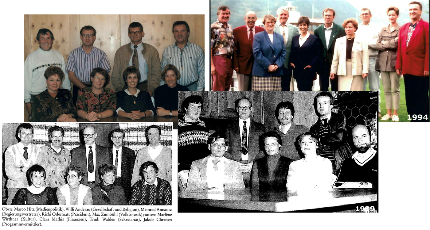 - 1980: Sein Nachfolger wird 1980 Josef (Beppi) von Matt junior, der Sohn des zweiten Präsidenten, Historiker und Buchhändler (zweiter von rechts). Schon drei Jahre später gibt er das Amt auf – und wird Präsident der Innerschweizer Rundspruchgesellschaft. Der Lehrer Marco Hitz (ganz rechts) übernimmt bis 1987, bevor die Delegierten das langjährige Vorstandsmitglied Richi Odermatt zum Präsidenten ernennen.