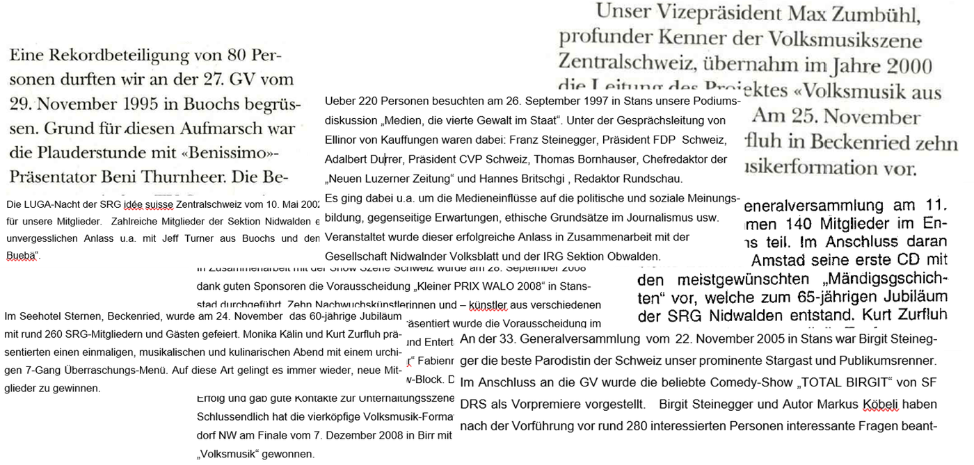 1995: Die Sektion Nidwalden hat es seit jeher verstanden, den Mitgliedern ein musikalisches und/oder erzählerisches Programm zu bieten unter Einbezug von bekannten Radio- und TV-Schaffenden. Hier eine kleine Auswahl der Highlights in der Geschichte der Sektion: