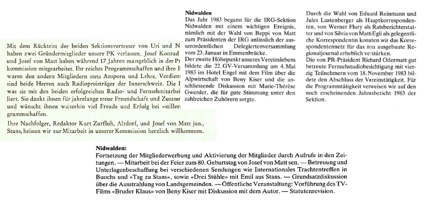 - 1970: Josef von Matt senior ist nicht nur seit 1954 Präsident der IRG Nidwalden, er amtet auch als Mitglied der Programmkommission der Innerschweizer Rundspruchgesellschaft (IRG). In letzterer Funktion sorgt er dafür, dass der kleine Stand Nidwalden nicht vergessen geht bei der Programmplanung. 1970 tritt Josef von Matt nach 17 Jahren in der Programmkommission zurück. Sein Nachfolger im Gremium ist Josef von Matt junior, sein Sohn. Bekannt als Beppi von Matt wird er 10 Jahre später zuerst Präsident der IRG Nidwalden und 1983 Präsident der IRG. Die Familie von Matt ist so eng mit der IRG verbunden, dass die IRG Nidwalden 1981 auch den 80. Geburtstag von Josef von Matt senior nicht nur mitfeiert, sondern mitorganisiert.