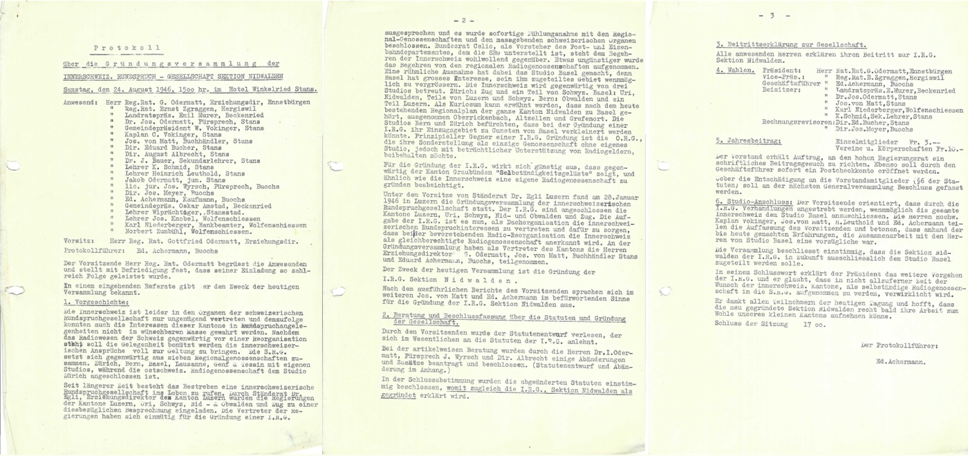 - 1946: An der Gründungsversammlung der Innerschweizerischen Rundspruch-Gesellschaft oder IRG am Montag, 28. Januar 1946, nehmen 3 Männer aus Nidwalden teil: Regierungsrat Gottfried Odermatt, Josef von Matt und Eduard Achermann. Ihnen erteilt IRG-Präsident Gotthard Egli am 18. April 1946 den Auftrag, «unverzüglich» die kantonale Sektion zu gründen. Dem kommen die drei Herren prompt nach: Die SRG Nidwalden wird am 24. August 1946 im Hotel Winkelried in Stans gegründet. Der erste Präsident heisst Gottfried Odermatt.