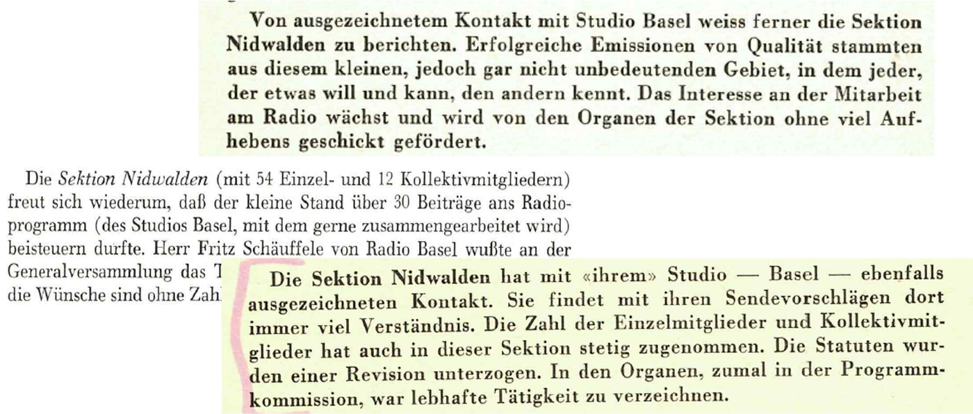 - 1954-1956: Josef von Matt, der im Radiostudio Zürich arbeitet, hat einen guten Draht auch ins Studio Basel, das für die Sendungen über und für Nidwalden zuständig ist. In den Jahresberichten 1954 und 1955 wird berichtet, dass die Nidwaldner Sektion «ausserordentliche Kontakte» mit dem Studio Basel pflegt, es wird sogar von «ihrem» Studio geschrieben. 1957 sendet das Studio Basel 30 Beiträge von und über den «kleinen Stand» Nidwalden. Stolz wird im Jahresbericht vermerkt, dass mit dem Studio Basel «gerne zusammengearbeitet wird». Und wie erfahren die Zuhörerinnen und Zuhörer, wenn es am Radio eine Sendung über und aus Nidwalden gibt? Die Sendungen werden in den «Nidwaldner Blättern» publiziert – wie es im Protokoll der Generalversammlung von 1956 heisst.