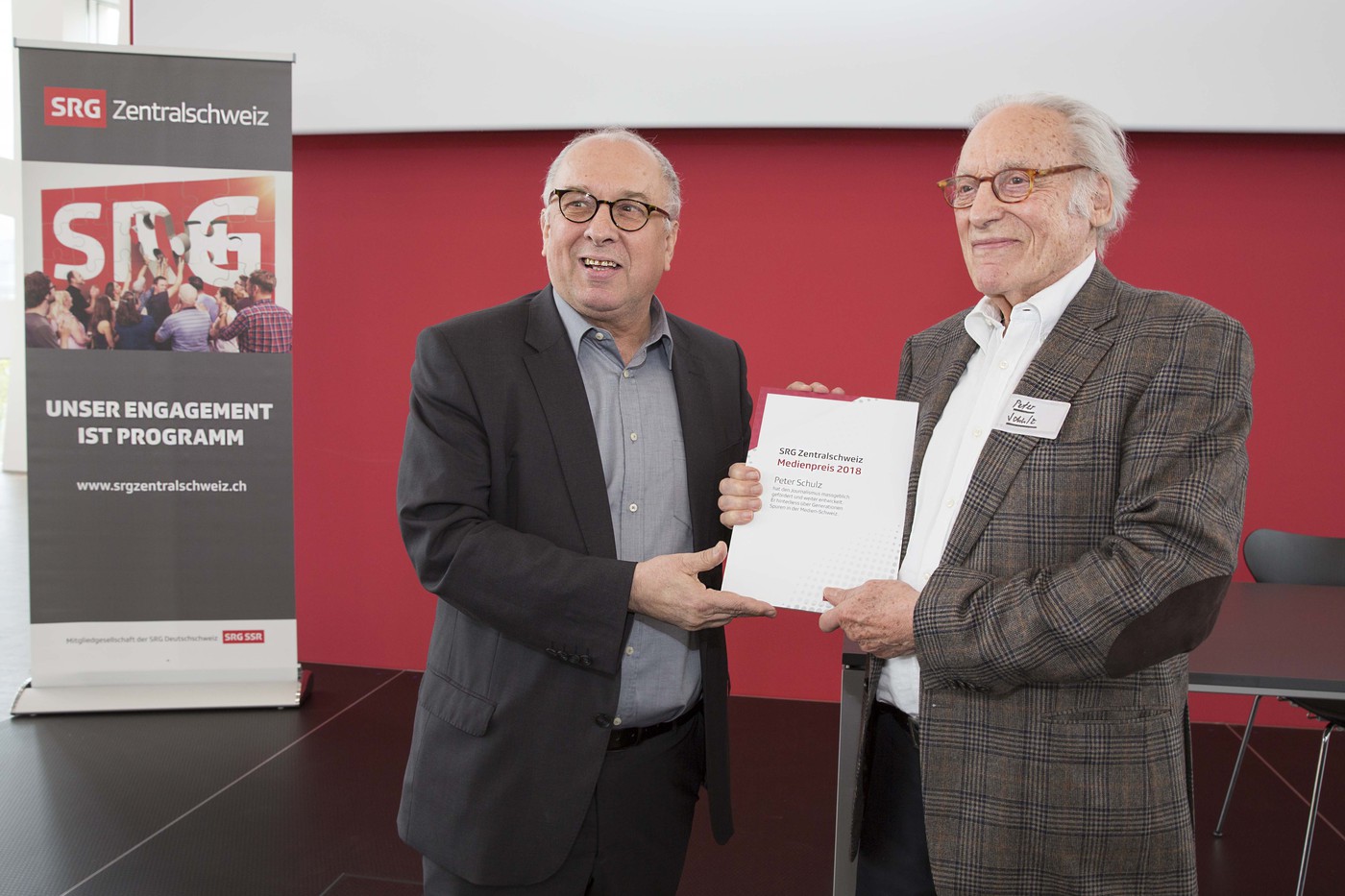 2018: Die SRG Zentralschweiz zeichnet Peter Schulz für seine einzigartigen Leistungen für den Journalismus und die Medien aus.